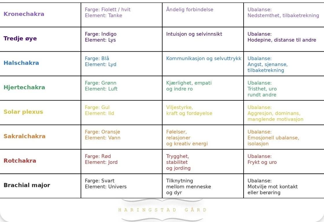 De mest kjente og aktuelle chakraene på hest er: